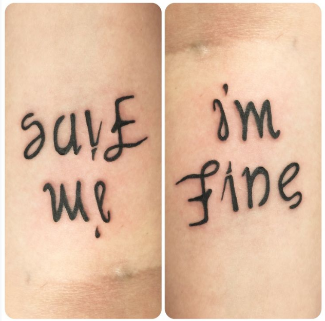 عنى لها الوشم الذي رسمته كثيراً، ويُقرأ الوشم من أكثر من جهة "أنا بخير"، لكن إن قرأته من جهة معينة ستجد أن المكتوب هو "أنقذوني"، وهذا تحديداً ما يشعر به المرضى العقليين والنفسيين، فهم يخبرون الجميع أنهم بخير لكن من داخلهم يحتاجون للمساعدة ويطلبونها. بحسب ما ترجمت شاشة نيوز.
